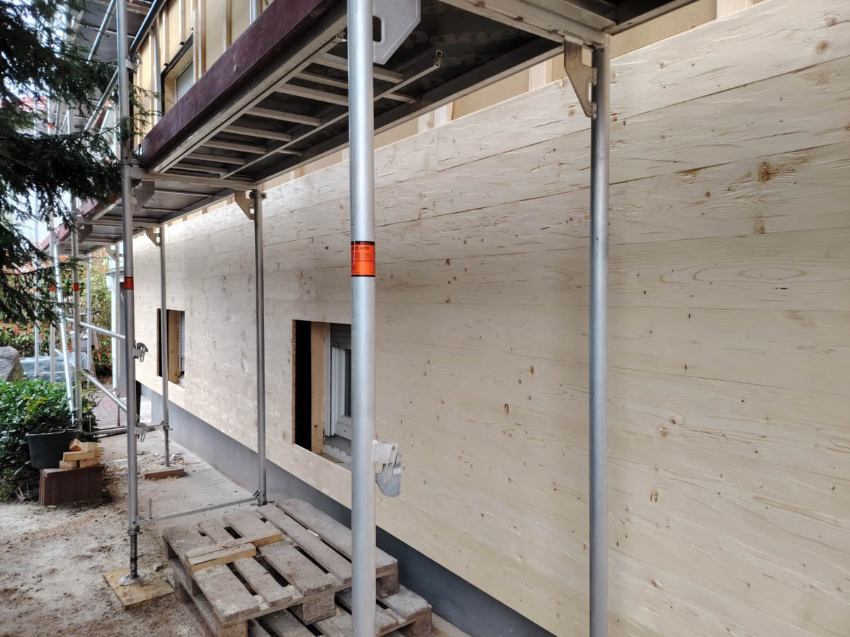 Das Projekt in Hammelbach umfasste die fachgerechte energetische Sanierung einer Hausfassade. Neben dem Schutz der Bausubstanz stand besonders die optische Aufwertung im Mittelpunkt. Der obere Gebäudeteil wurde mit einem hochwertigen PREFA‑Fassadensystem verkleidet. Im unteren Bereich kamen Hölzer aus Fichte mit gehackter Oberfläche zum Einsatz. So entstand eine Fassade mit besonderem Charme und klarer Ästhetik – witterungsbeständig, langlebig und nachhaltig. Jedes Detail wurde mit handwerklicher Präzision ausgeführt, um eine dauerhaft hochwertige und stimmige Gesamtlösung zu schaffen.
